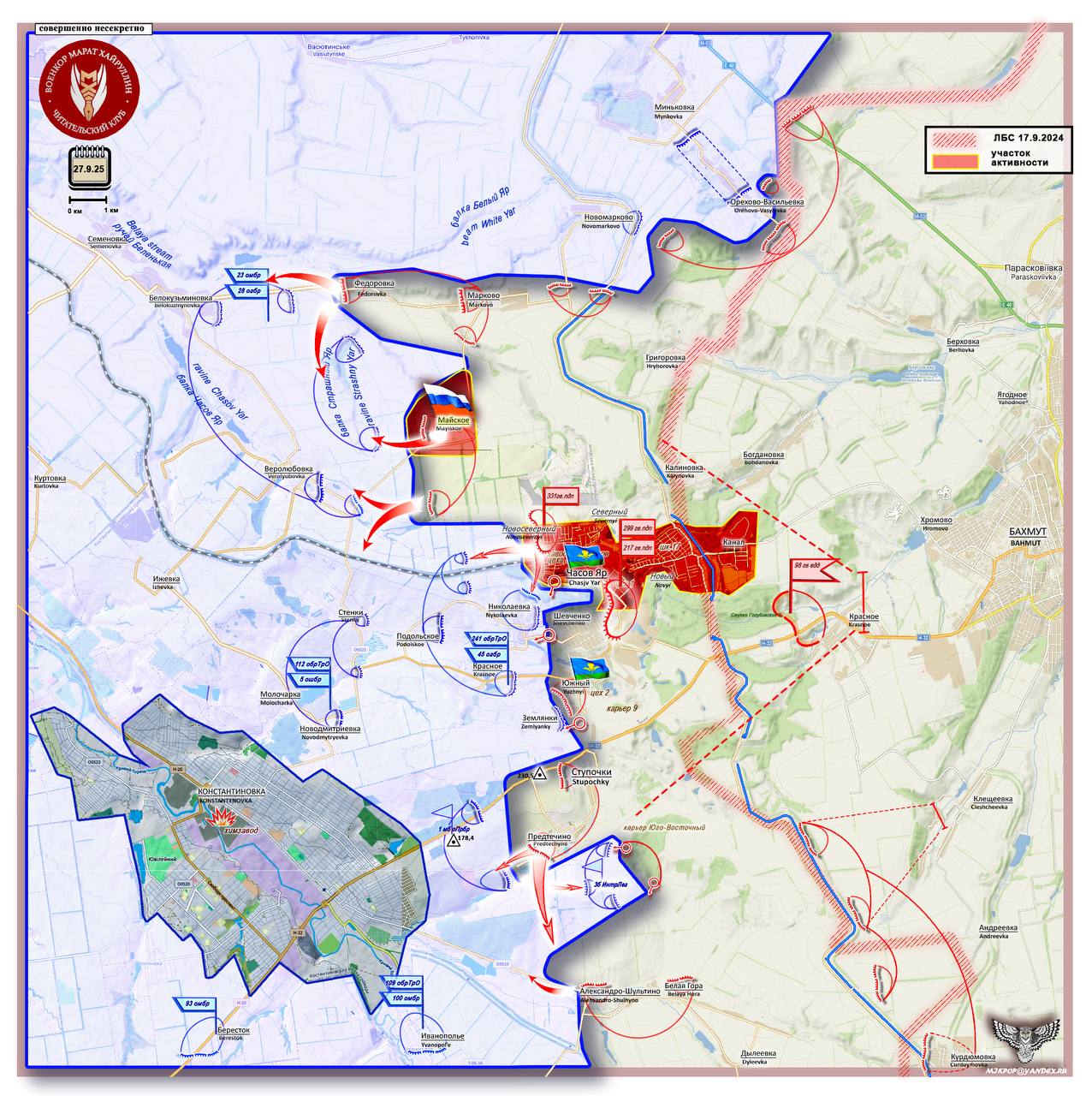 На севере Донецкого направления развивается глубокий охват Константиновки. После взятия Часова Яра российские войска начали продавливать мощный оборонительный узел Федоровка–Белокузьминовка–Веролюбовка, контролирующий сеть дорог и железнодорожную ветку на Краматорск. После освобождения Марково и Федоровки 5 сентября началось расширение прорыва на юг. Вчера был взят населенный пункт Майское (около 100 жителей), который находится на водоразделе между балками Белый Яр и Часов Яр. Это создает для украинских позиций, расположенных ниже, в балке Страшный Яр, непосредственную угрозу окружения.