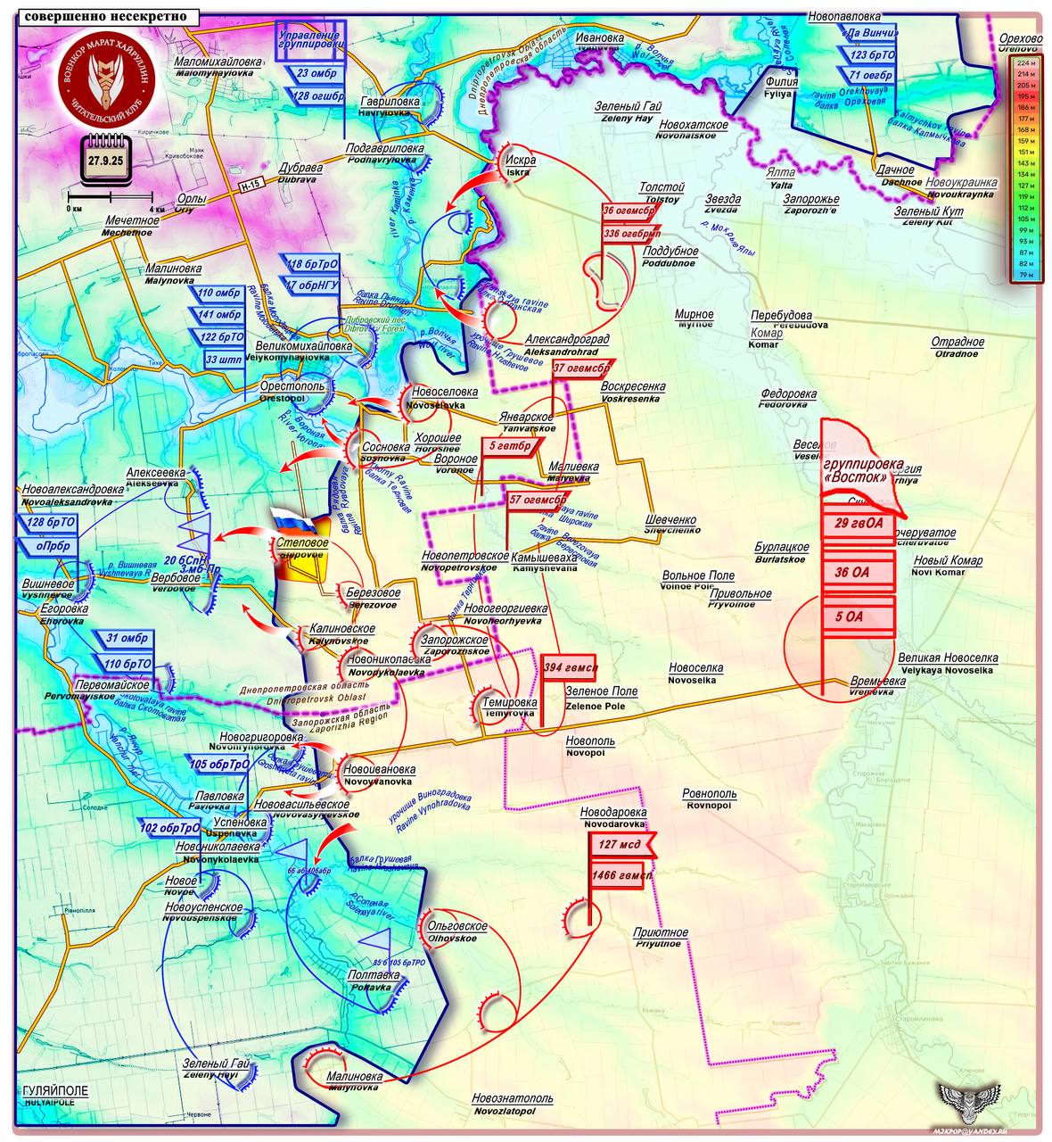 На юге Донецкого направления продолжается наступление на оборонительный район Вишневое. Цель – вывести из строя рокадную дорогу Покровское – Гуляйполе. Вчера российские войска освободили село Степовое. Этот небольшой населенный пункт занимает тактически выгодное положение на высоком берегу речки Вишневая, всего в трех километрах от дороги Орестополь-Алексеевка. Эта дорога связывает два крупных узла обороны ВСУ. Перерезая транспортную артерию между ними, российские подразделения создают условия для их последующей изоляции и уничтожения.