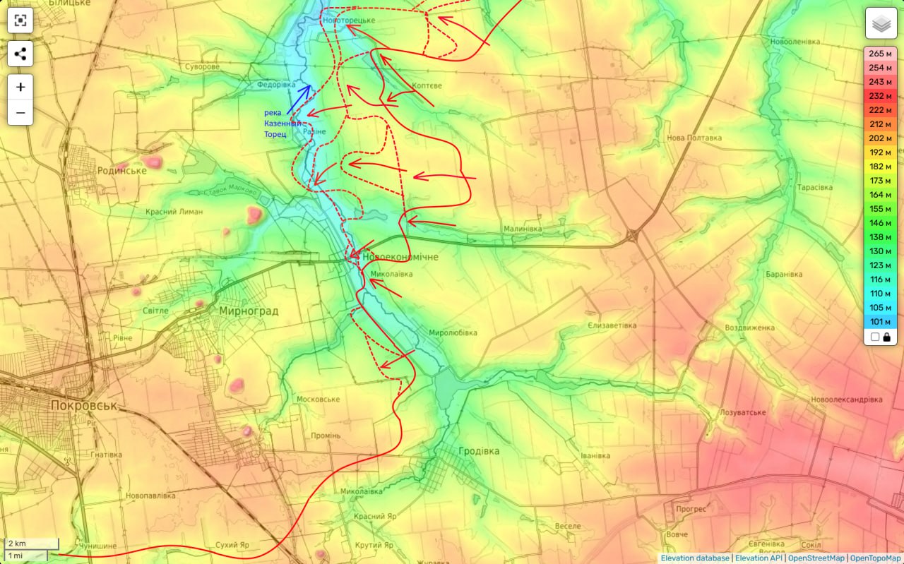 Таким образом мы видим, что части нашей 51А, наступая широким фронтом, уже практически полностью зачистили от противника восточный берез Казенного Торца начиная от Тоновотеецкого, а в нескольких местах переправившись через него сумели создать тактические плацдармы, с которых далее будут развивать наступление в обход Мирнограда с северо-востока и севера.
