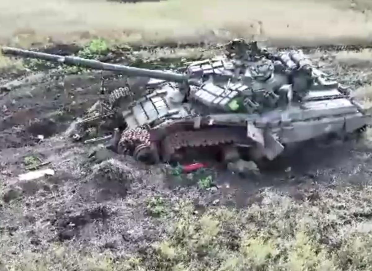 Украинский коптер снимает тоже украинский уничтоженный Т-64БВ под Клещеевкой