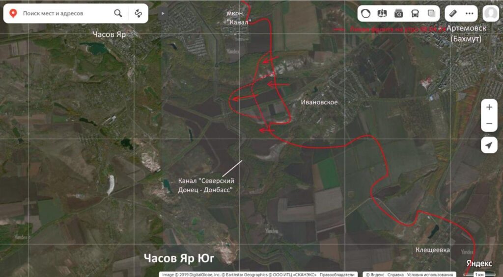 Так же поступает информация о продвижении до 500 метров севернее микрорайона «Канал». На юге российские подразделения совершают попытки расширить зону контроля в направлении Константиновки вдоль трассы Т-0504. Противник пытается снизить интенсивность продвижения ВС РФ на данном участке регулярно атакуя выявленную бронетехнику российских войск в районе Красного.